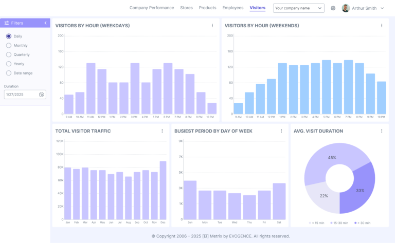 The analytics platform visualizes total traffic, visit duration, and hourly patterns to reveal peak and low-activity times.